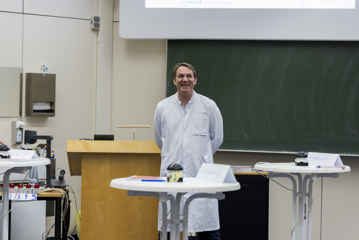 Eine hochkarätige Jury bewertete die Leistungen der Teams: Prof. Dr. Michael Koziolek (UMG, Nephrologie), Dr. Jörg Larsen (UMG, Radiologie), Dr. Michael Schön (Ulm, Anatomie), Dr. Gabriel Cassinelli (UMG, Nephrologie), Ingmar Finkenzeller (UMG, Anästhesiologie). Geleitet wurde der Wettbewerb von Dr. Axel Schunk (Charité Berlin), der gemeinsam mit seinem fünfköpfigen Team extra für den Contest nach Göttingen gereist war und eine professionelle Buzzeranlage mitgebracht hat.