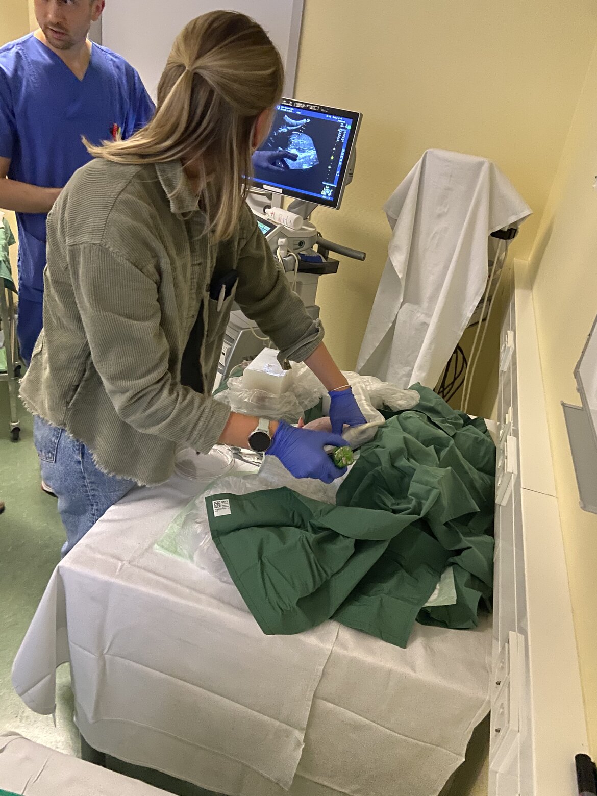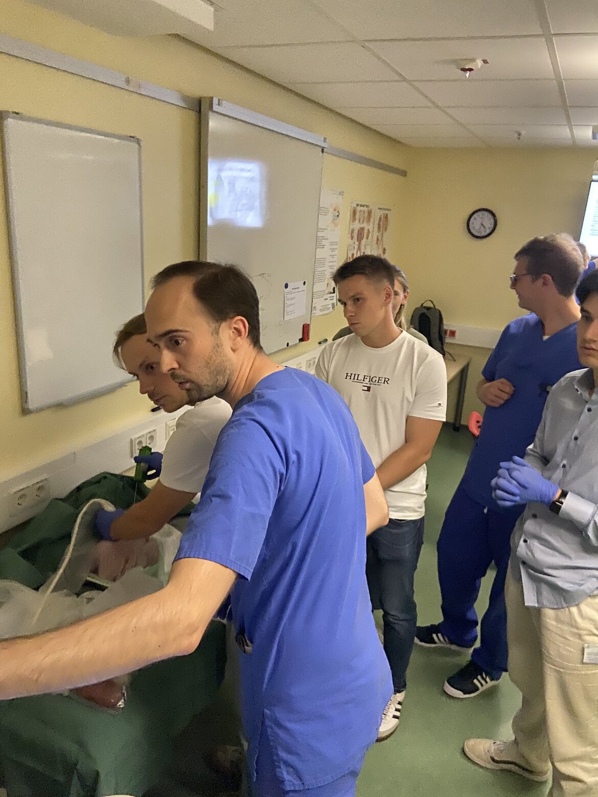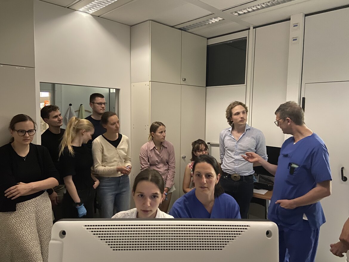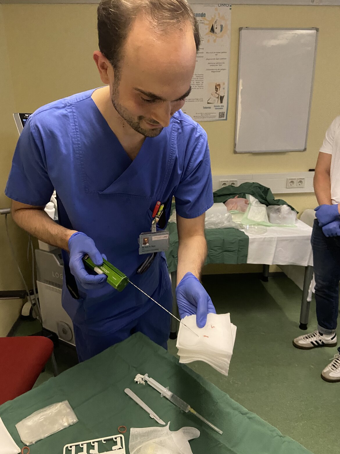 Das Highlight an dem Tag stellte die Nierenbiopsiestation von Dr. Gregor Rapp und Dr. Ann-Kathrin Schäfer dar, bei dem die Studierenden neben der Biopsieindikation auch selbst eine Sonographie-gesteuerte Nierenbiopsie am Modell durchführen konnten.
