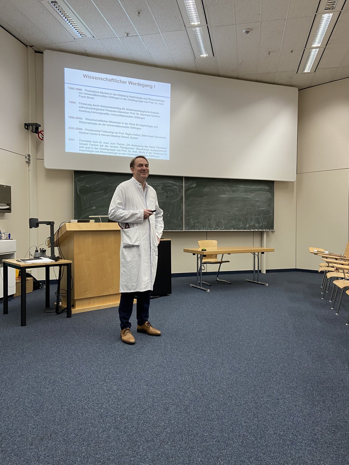 Auftakt mit Perspektive Bereits beim der Begrüßung durch Prof. Dr. Manuel Wallbach wurde deutlich: Bei der Veranstaltung geht es nicht nur um Fachwissen, sondern auch um Leidenschaft für Medizin. In einem inspirierenden Impulsvortrag skizzierte der Direktor der Klinik für Nephrologie und Rheumatologie Prof. Dr. Michael Zeisberg seinen Werdegang hin zum Klinikdirektor an der UMG, warum die Nephrologie mehr ist als nur Dialyse ist und wohin sich das Fach in Forschung und Klinik in den nächsten Jahren entwickeln wird.
