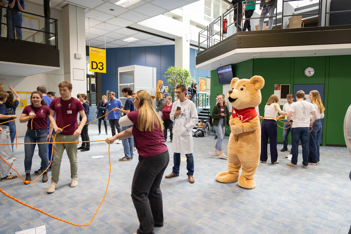 Auch andere Aufgaben stellten die Teilnehmenden vor Herausforderungen: In der Fallvignetten-Runde konnten diagnostische Verfahren angefordert werden, um die Lösung kniffliger Fälle zu erarbeiten. Hinzu kamen praktische Übungen wie die Lumbalpunktion am Model, aus dem STÄPS der UMG und Aufgabe zum Teamwork „Konstruiert eine vorgegebene geometrische Figur aus einem Seil“ die von Ingmar Finkenzellen aus der Anästhesiologie der UMG organisiert und durchgeführt wurden.